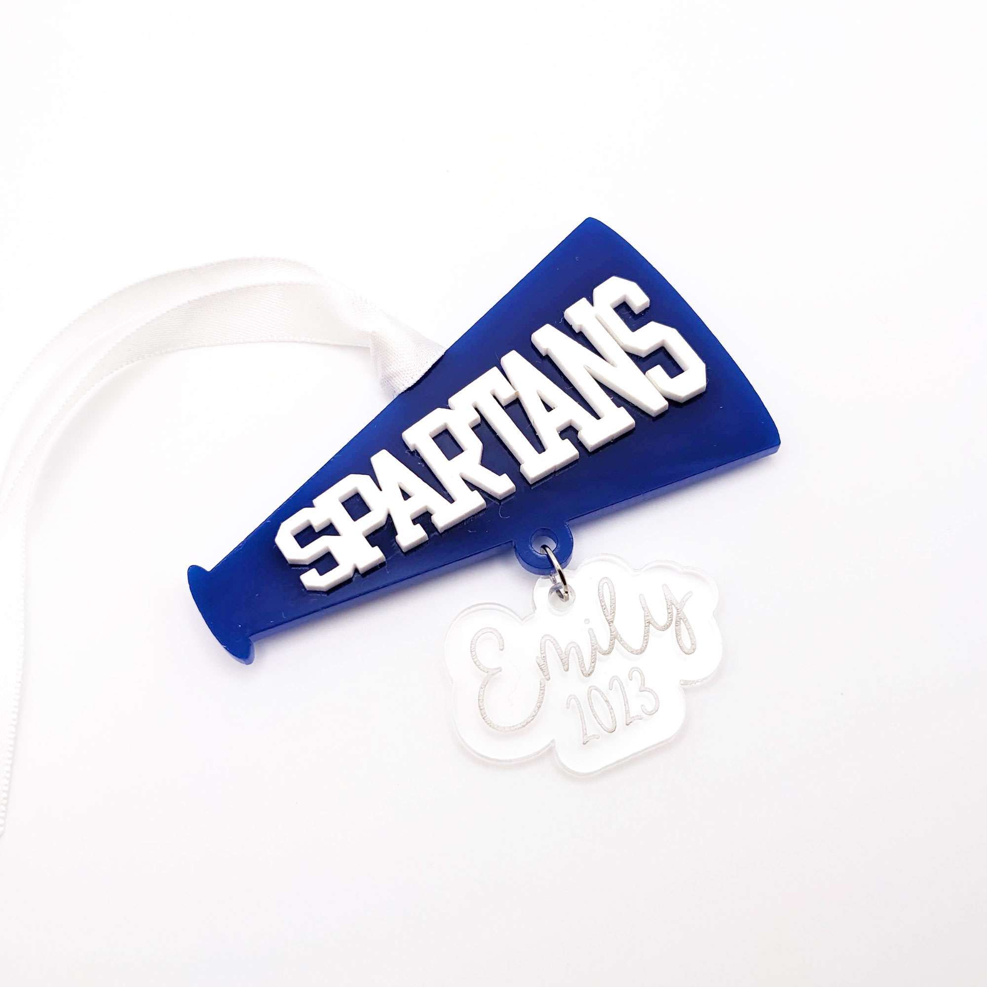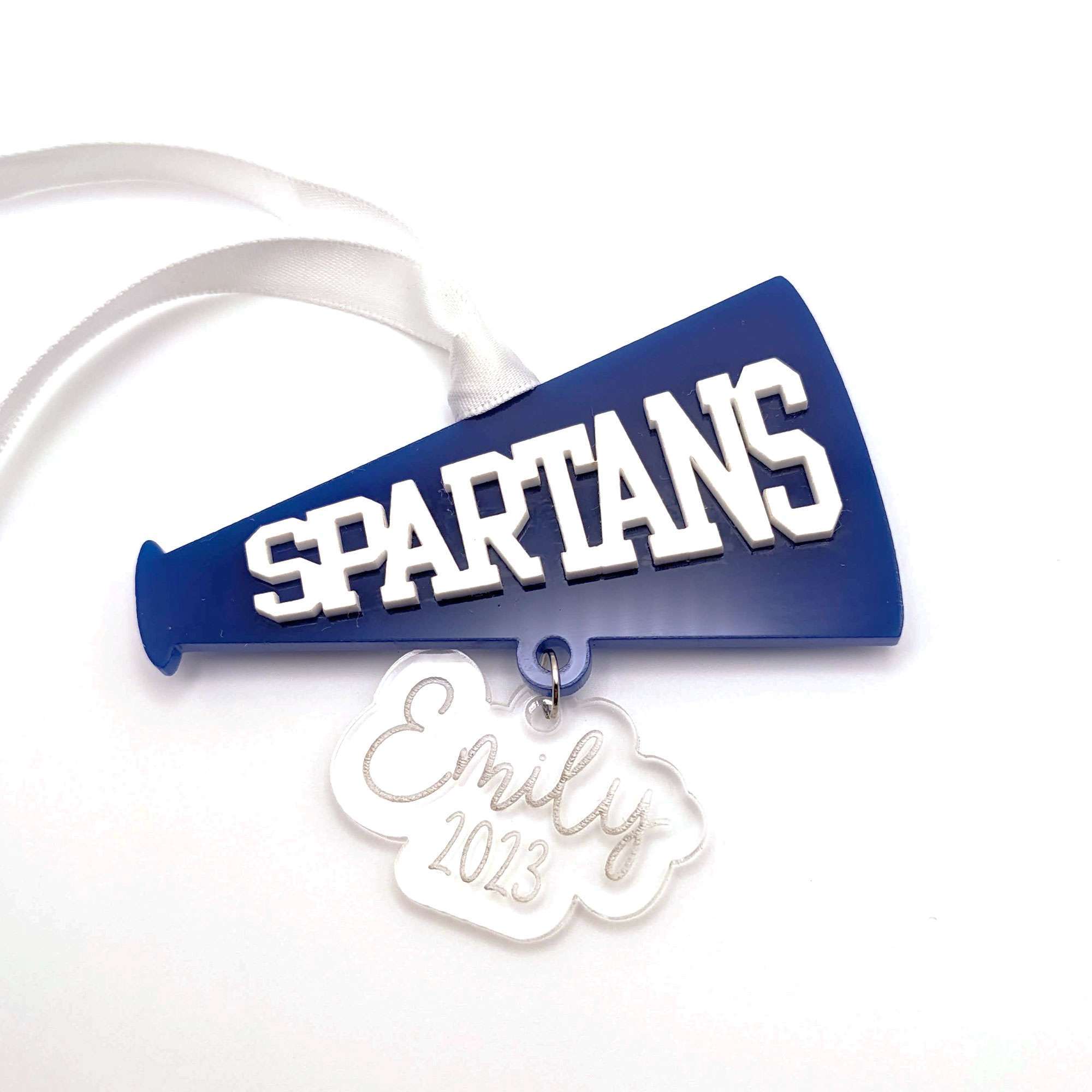 Commemorate another great cheer season this year with a custom Spartan ornament! Featuring a blue Spartan megaphone and a custom acrylic charm, this keepsake is made of blue and white acrylic and is personalized with the name of your choice. It hangs from a length of white satin ribbon for you to tie somewhere special. Please note that each ornament is individually handmade to order and may vary ever so slightly from the item pictured. Small imperfections may occur.
